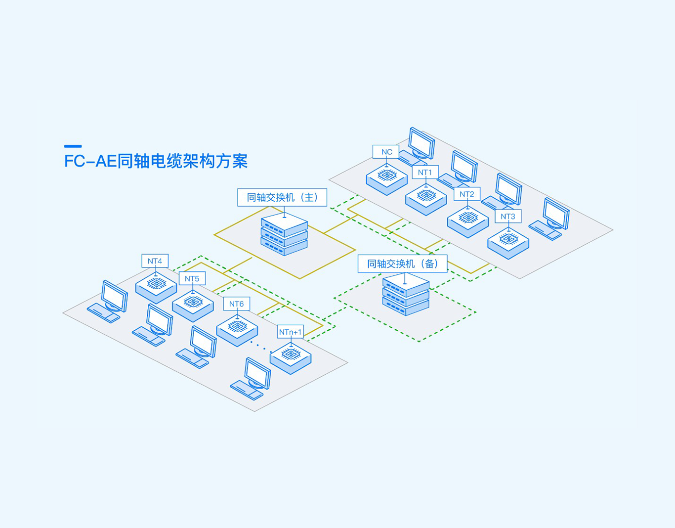 FC-AE同轴电缆架构方案,在同轴电缆上,通过同轴交换机实现1.0625Gbps的高速数据传输,根据铜缆的材质情况,可以实现10-40M距离数据传输。同轴交换机能实现NC、NT节点的有机互联,为各网络终端提供无阻塞低延时的数据交换和通信。